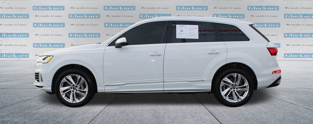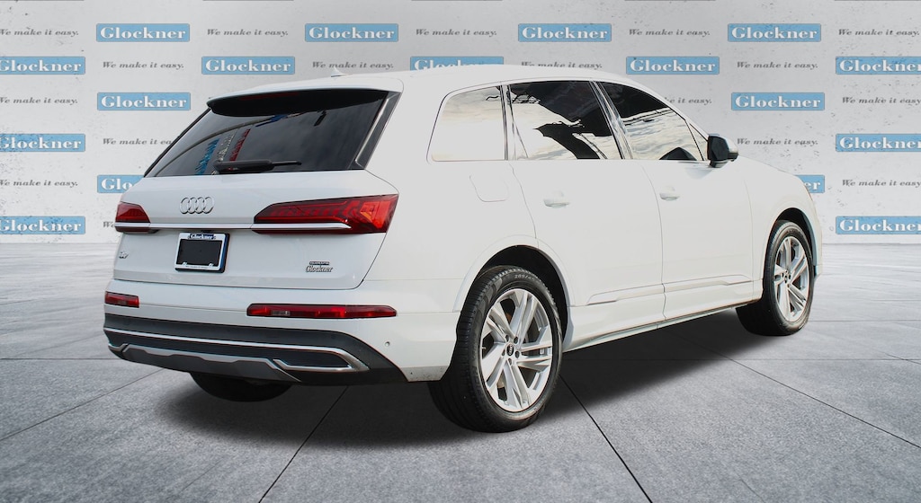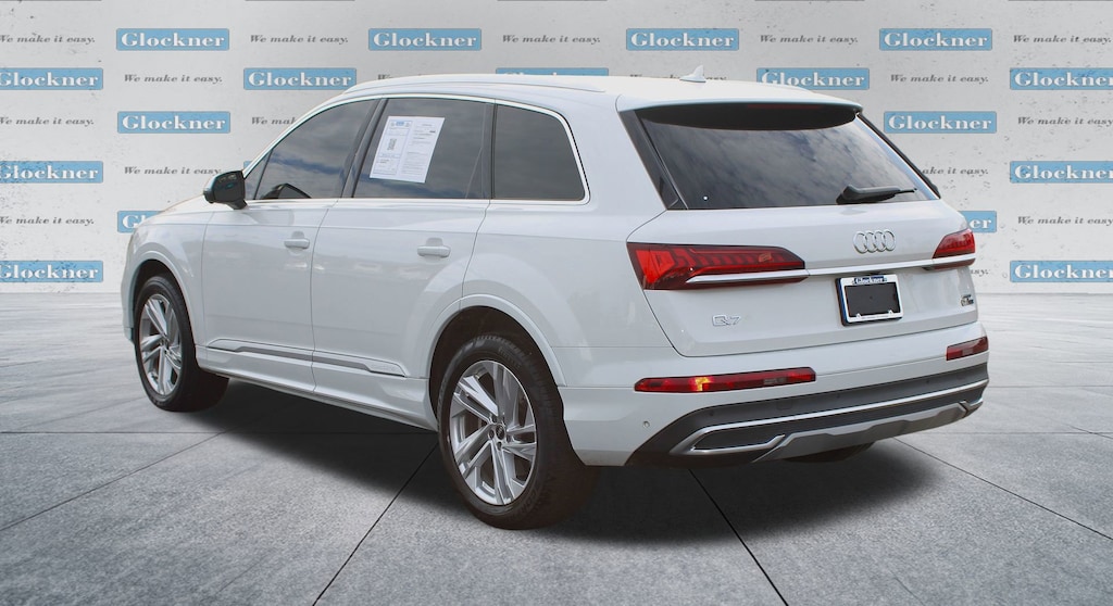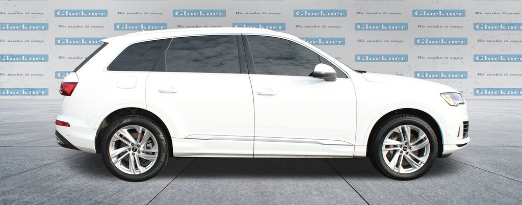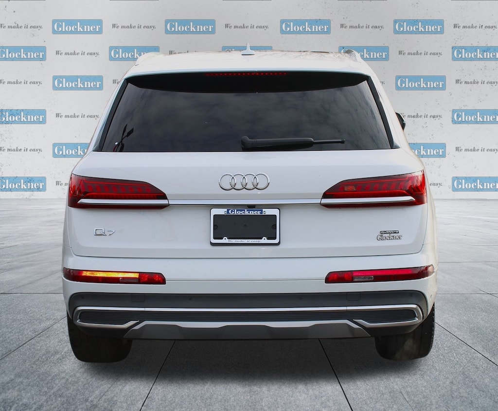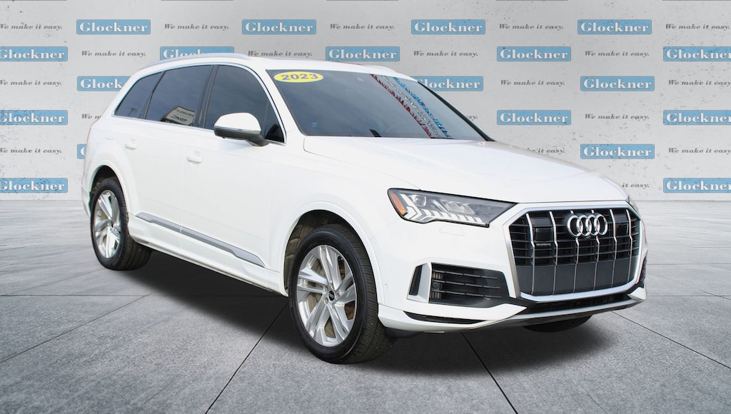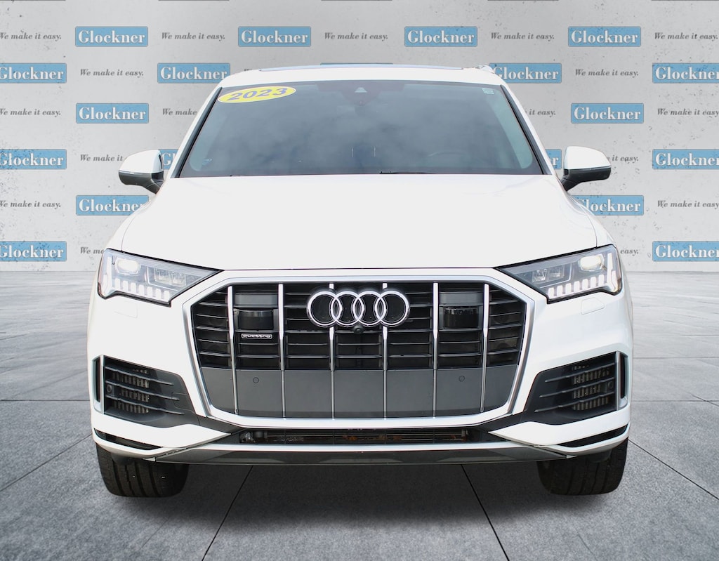 Glockner Chevrolet is proud to offer this superb 2023 Audi Q7 in White. This 2023 Audi Q7 has passed our comprehensive inspection and comes with the following features; Navigation system: Audi MMI Navigation plus with Touch Response, Power Liftgate, Power moonroof: Panoramic, 10 Speakers, 3.204 Axle Ratio, 3rd row seats: bench, 4-Wheel Disc Brakes, ABS brakes, Air Conditioning, Alloy wheels, AM/FM radio: SiriusXM w/ 360L, Auto High-beam Headlights, Auto-dimming door mirrors, Auto-dimming Rear-View mirror, Automatic temperature control, Brake assist, Bumpers: body-color, Compass, Delay-off headlights, Driver door bin, Driver vanity mirror, Dual front impact airbags, Dual front side impact airbags, Electronic Stability Control, Emergency communication system: Audi connect CARE, Exterior Parking Camera Rear, Four wheel independent suspension, Front anti-roll bar, Front Bucket Seats, Front Center Armrest, Front dual zone A/C, Front fog lights, Front reading lights, Fully automatic headlights, Garage door transmitter: HomeLink, Genuine wood door panel insert, Heated door mirrors, Heated Front Bucket Seats, Heated front seats, Illuminated entry, Leather Seating Surfaces, Leather Shift Knob, Leather steering wheel, Low tire pressure warning, Memory seat, Occupant sensing airbag, Outside temperature display, Overhead airbag, Overhead console, Panic alarm, Passenger door bin, Passenger vanity mirror, Power door mirrors, Power driver seat, Power passenger seat, Power steering, Power windows, Radio data system, Radio: Audi Sound System, Rain sensing wipers, Rear air conditioning, Rear anti-roll bar, Rear fog lights, Rear reading lights, Rear seat center armrest, Rear side impact airbag, Rear window defroster, Rear window wiper, Reclining 3rd row seat, Remote keyless entry, Roof rack: rails only, Security system, Speed control, Speed-sensing steering, Split folding rear seat, Spoiler, Steering wheel memory, Steering wheel mounted audio controls, Tachometer, Telescoping steering wheel, Tilt steering wheel, Traction control, Trip computer, Turn signal indicator mirrors, Variably intermittent wipers, and Wheels: 19 5-Arm-Star Design.