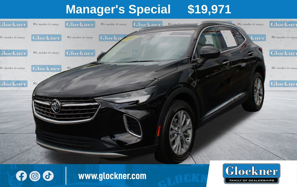 Certified. Certification Program Details: 12 Months or 12,000 miles Comprehensive Warranty. 5 Years or 100,000 miles Powertrain Warranty.Glockner of Ironton is proud to offer this superb-looking 2022 Buick Envision in Ebony Twilight Metallic. This 2022 Buick Envision has passed our comprehensive inspection and comes with the following features; Comfort & Convenience Package (7-Speaker Audio System Feature w/Amplifier, Air Quality Indicator Sensor, Automatic Air Circulation/Air Quality Sensor, Dual-Zone ACC Air Conditioning, Hands Free Power Programmable Liftgate, Heated Driver & Front Passenger Seats, Heated Steering Wheel, Radio: Buick Infotainment System AM/FM Stereo, Remote Vehicle Starter System, SiriusXM Radio, and Wireless Apple CarPlay/Wireless Android Auto), Preferred Equipment Group 1SC, Safety Package (Lane Change Alert w/Side Blind Zone Alert and Rear Cross Traffic Alert), Envision Preferred, Glockner Certified Certified, 4D Sport Utility, 2.0L Turbocharged, Ebony Twilight Metallic, 3 Years of OnStar & Connected Services Plan, 3.47 Final Drive Axle Ratio, 4-Wheel Disc Brakes, 6 Speakers, 6-Speaker Audio System Feature, 8-Way Power Driver Seat Adjuster, ABS brakes, Air Conditioning, Alloy wheels, AM/FM radio: SiriusXM, Apple CarPlay/Android Auto, Auto High-beam Headlights, Auto-dimming door mirrors, Auto-dimming Rear-View mirror, Brake assist, Bumpers: body-color, Cloth w/Leatherette Seat Trim, Compass, Delay-off headlights, Driver door bin, Driver vanity mirror, Dual front impact airbags, Dual front side impact airbags, Electronic Stability Control, Emergency communication system: OnStar and Buick connected services capable, Four wheel independent suspension, Front anti-roll bar, Front Bin Center Console USB Ports, Front Bucket Seats, Front Center Armrest, Front Passenger 6-Way Manual Seat Adjuster, Front reading lights, Fully automatic headlights, Heated door mirrors, Illuminated entry, Knee airbag, Low tire pressure warning, Not Equipped w/Driver & Fr Passenger Heated Seats, Not Equipped w/Rear Park Assist, Occupant sensing airbag, Outside temperature display, Overhead airbag, Overhead console, Panic alarm, Passenger door bin, Passenger vanity mirror, Power door mirrors, Power driver seat, Power steering, Power windows, Premium audio system: Buick Infotainment System, Radio data system, Radio: 8 Diagonal Buick Infotainment System, Rear anti-roll bar, Rear reading lights, Rear seat center armrest, Rear window defroster, Rear window wiper, Remote keyless entry, Roof rack: rails only, Security system, Speed control, Split folding rear seat, Spoiler, Steering wheel mounted audio controls, Telescoping steering wheel, Tilt steering wheel, Traction control, Trip computer, USB Charging-Only Ports, Variably intermittent wipers, and Wheels: 18 Aluminum w/Light Charcoal Met Finish.Clean Auto Check/No Accidents Reported, Bluetooth / Hands-Free Calling, Rear View Back Up Camera, Apple CarPlay/Android Auto, Envision Preferred, 4D Sport Utility, 2.0L Turbocharged, Ebony Twilight Metallic, 7-Speaker Audio System Feature w/Amplifier, Air Quality Indicator Sensor, Automatic Air Circulation/Air Quality Sensor, Comfort & Convenience Package, Dual-Zone ACC Air Conditioning, Hands Free Power Programmable Liftgate, Heated Driver & Front Passenger Seats, Heated Steering Wheel, Lane Change Alert w/Side Blind Zone Alert, Preferred Equipment Group 1SC, Radio: Buick Infotainment System AM/FM Stereo, Rear Cross Traffic Alert, Remote Vehicle Starter System, Safety Package, SiriusXM Radio, Wireless Apple CarPlay/Wireless Android Auto.24/31 City/Highway MPG
