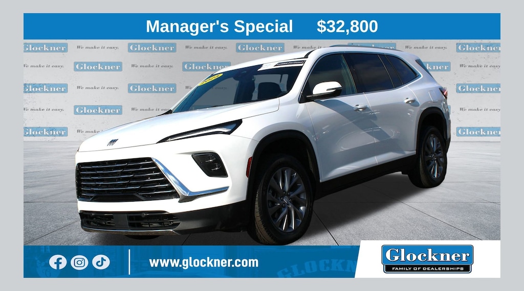Glockner Chevrolet is proud to offer this handsome-looking 2025 Buick Enclave in Summit White. This 2025 Buick Enclave has passed our comprehensive inspection and comes with the following features; Preferred Equipment Group 1SD, Enclave Preferred, Glockner Certified Certified, 4D Sport Utility, Summit White, Front Bucket Seats, Heated door mirrors, Heated front seats, Heated steering wheel, Navigation System, Power Liftgate, Power passenger seat, 12 Speakers, 3rd row seats: split-bench, 4-Wheel Disc Brakes, ABS brakes, Air Conditioning, Alloy wheels, AM/FM radio: SiriusXM with 360L, Auto High-beam Headlights, Auto-dimming door mirrors, Auto-dimming Rear-View mirror, Automatic temperature control, Bose Premium 12-Speaker Audio System, Brake assist, Bumpers: body-color, Compass, Delay-off headlights, Deleted OnStar Basics, Driver 4-Way Power Lumbar Seat Adjuster, Driver 8-Way Power Seat Adjuster, Driver door bin, Driver vanity mirror, Dual front impact airbags, Dual front side impact airbags, Electronic Stability Control, Emergency communication system: OnStar and Buick connected services capable, Four wheel independent suspension, Front anti-roll bar, Front Center Armrest, Front dual zone A/C, Front Passenger 4-Way Power Lumbar Seat Adjuster, Front Passenger 6-Way Power Seat Adjuster, Front reading lights, Fully automatic headlights, Illuminated entry, Leather steering wheel, Leatherette Seat Trim, Low tire pressure warning, Occupant sensing airbag, Outside temperature display, Overhead airbag, Overhead console, Panic alarm, Passenger door bin, Passenger vanity mirror, Power door mirrors, Power driver seat, Power steering, Power windows, Premium audio system: Buick Infotainment System, Radio data system, Radio: Infotainment Center, Rear air conditioning, Rear anti-roll bar, Rear reading lights, Rear side impact airbag, Rear window defroster, Rear window wiper, Remote keyless entry, Security system, Speed control, Speed-sensing steering, Spoiler, Steering wheel mounted audio controls, Tachometer, Telescoping steering wheel, Tilt steering wheel, Traction control, Trip computer, Turn signal indicator mirrors, Variably intermittent wipers, Voltmeter, Wireless Apple CarPlay, and Wireless Google Android Auto.