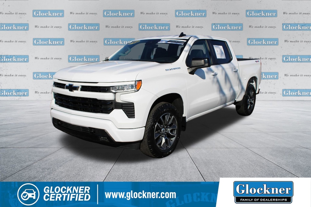 Glockner Chevrolet is proud to offer this trusty 2023 Chevrolet Silverado 1500 in Summit White. This 2023 Chevrolet Silverado 1500 has passed our comprehensive inspection and comes with the following features; Convenience Package (10-Way Power Driver Seat w/Lumbar, 120-Volt Bed Mounted Power Outlet, 120-Volt Instrument Panel Power Outlet, Dual Rear USB Ports (Charge Only), Dual-Zone Automatic Climate Control, Electric Rear-Window Defogger, Heated Driver & Front Outboard Passenger Seats, Heated Steering Wheel, Keyless Open & Start, Remote Vehicle Starter System, Theft Deterrent System (Unauthorized Entry), and Wrapped Steering Wheel), High Capacity Suspension Package, Preferred Equipment Group 1SP (12.3 Multicolor Reconfigurable Digital Display, 6-Speaker Audio System, All-Star Edition, Auto-Locking Rear Differential, Bluetooth® For Phone, Chevrolet Connected Access Capable, Color-Keyed Carpeting Floor Covering, Compass, Deep-Tinted Glass, Electrical Steering Column Lock, Electronic Cruise Control, EZ Lift Power Lock & Release Tailgate, Front Frame-Mounted Black Recovery Hooks, Front LED Fog Lamps, Front Rubberized Vinyl Floor Mats, HD Rear Vision Camera, Heated Power-Adjustable Outside Mirrors, High Gloss Black Mirror Caps, Inside Rear-View Mirror w/Tilt, LED Cargo Area Lighting, OnStar & Chevrolet Connected Services Capable, Power Front Windows w/Driver Express Up/Down, Power Front Windows w/Passenger Express Down, Power Rear Windows w/Express Down, Rear 60/40 Folding Bench Seat (Folds Up), Rear Rubberized-Vinyl Floor Mats, SiriusXM w/360L, Standard Tailgate, Steering Wheel Audio Controls, Wi-Fi Hot Spot Capable, and Wireless Phone Projection), Standard Suspension Package, Trailering Package (Hitch Guidance), Silverado 1500 RST, Glockner Certified Certified, 4D Crew Cab, EcoTec3 5.3L V8, 4WD, Summit White, 220 Amp Alternator, 3.23 Rear Axle Ratio, 4-Wheel Disc Brakes, 40/20/40 Front Split-Bench Seat, 6 Speakers, ABS brakes, Air Conditioning, All-Weather Floor Liner (LPO), Alloy wheels, AM/FM radio: SiriusXM with 360L, Apple CarPlay/Android Auto, Auto High-beam Headlights, Automatic Emergency Braking, Automatic temperature control, Brake assist, Bumpers: body-color, Cloth Seat Trim, Delay-off headlights, Driver door bin, Driver vanity mirror, Dual front impact airbags, Dual front side impact airbags, Electronic Stability Control, Following Distance Indicator, Forward Collision Alert, Front anti-roll bar, Front Center Armrest w/Storage, Front dual zone A/C, Front fog lights, Front Pedestrian Braking, Front reading lights, Front wheel independent suspension, Fully automatic headlights, Heated door mirrors, Heated front seats, Heated steering wheel, Illuminated entry, IntelliBeam Automatic High Beam On/Off, Lane Keep Assist w/Lane Departure Warning, Low tire pressure warning, Not Equipped w/Steering Column Lock, Occupant sensing airbag, Outside temperature display, Overhead airbag, Overhead console, Panic alarm, Passenger door bin, Passenger vanity mirror, Power door mirrors, Power driver seat, Power steering, Power windows, Premium audio system: Chevrolet Infotainment 3 Premium, Radio data system, Radio: Chevrolet Infotainment 3 Premium System, Rear reading lights, Rear step bumper, Rear window defroster, Remote keyless entry, Security system, Speed control, Speed-sensing steering, Split folding rear seat, Steering wheel mounted audio controls, Tachometer, Telescoping steering wheel, Tilt steering wheel, Traction control, Trip computer, Variably intermittent wipers, Voltmeter, Wheels: 18 x 8.5 Bright Silver Painted Aluminum, and Wheels: 20 x 9 Painted Aluminum.