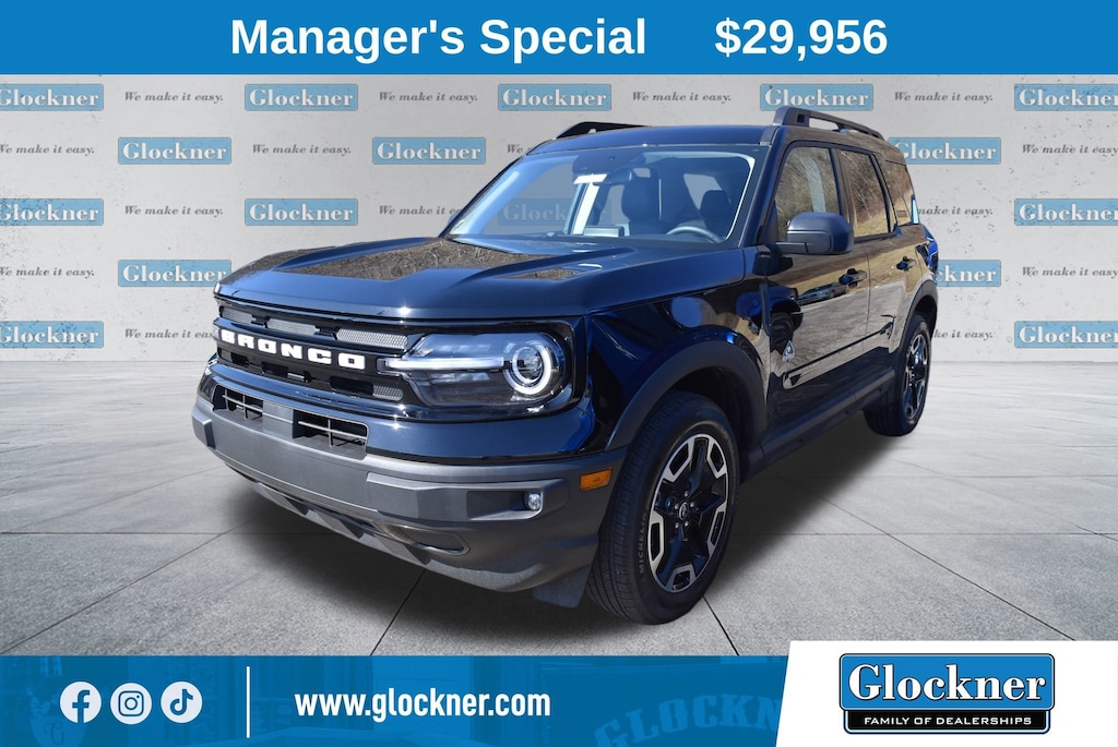 Certified. Certification Program Details: 12 Months or 12,000 miles Comprehensive Warranty. 5 Years or 100,000 miles Powertrain Warranty.Glockner of Ironton is proud to offer this good-looking 2024 Ford Bronco Sport in Shadow Black. This 2024 Ford Bronco Sport has passed our comprehensive inspection and comes with the following features; Equipment Group 300A, Ford Co-Pilot360 Assist+ (Voice-Activated Touchscreen Navigation System, Evasive Steering Assist, and Intelligent Adaptive Cruise Control w/Stop & Go), Tech Package (Universal Garage Door Opener (UGDO), Wireless Charging Pad, and HD Radio), Glockner Certified Certified, 1.5L EcoBoost, 8-Speed Automatic, 4WD, 4-Wheel Disc Brakes, ABS brakes, Four wheel independent suspension, Front dual zone A/C, Heated door mirrors, Low tire pressure warning, Rain sensing wipers, Speed-sensing steering, Speed-Sensitive Wipers, SYNC 3 Communications & Entertainment System, Traction control, 3.80 Axle Ratio, 6 Speakers, Air Conditioning, Alloy wheels, AM/FM radio: SiriusXM, AM/FM Stereo, Auto High-beam Headlights, Auto-dimming Rear-View mirror, Automatic temperature control, Brake assist, Compass, Delay-off headlights, Driver door bin, Driver vanity mirror, Dual front impact airbags, Dual front side impact airbags, Electronic Stability Control, Emergency communication system: SYNC 3 911 Assist, Front anti-roll bar, Front Bucket Seats, Front Center Armrest, Front fog lights, Front reading lights, Fully automatic headlights, Heated front seats, Heated steering wheel, Illuminated entry, Knee airbag, Memory seat, Occupant sensing airbag, Outside temperature display, Overhead airbag, Overhead console, Panic alarm, Passenger door bin, Passenger vanity mirror, Power door mirrors, Power driver seat, Power passenger seat, Power steering, Power windows, Premium-Trimmed Heated Sport Contour Bucket Seats, Radio data system, Rear anti-roll bar, Rear Parking Sensors, Rear reading lights, Rear seat center armrest, Rear window defroster, Rear window wiper, Remote keyless entry, Security system, SiriusXM, Speed control, Split folding rear seat, Steering wheel mounted audio controls, Tachometer, Telescoping steering wheel, Tilt steering wheel, Trip computer, Variably intermittent wipers, and Wheels: 18 Ebony Black-Painted Aluminum.Alloy Rims, Leather Seating, Power Seats, Heated Seats, Sirius XM Satellite Radio, Navigation / GPS / NAV, Back Up Camera, Bluetooth, Remote Start, 1.5L EcoBoost, 8-Speed Automatic, 4WD, 4-Wheel Disc Brakes, ABS brakes, Four wheel independent suspension, Front dual zone A/C, Heated door mirrors, Low tire pressure warning, Rain sensing wipers, Speed-sensing steering, Speed-Sensitive Wipers, SYNC 3 Communications & Entertainment System, Traction control, Universal Garage Door Opener (UGDO), Voice-Activated Touchscreen Navigation System, Wireless Charging Pad.Odometer is 2560 miles below market average!25/29 City/Highway MPG