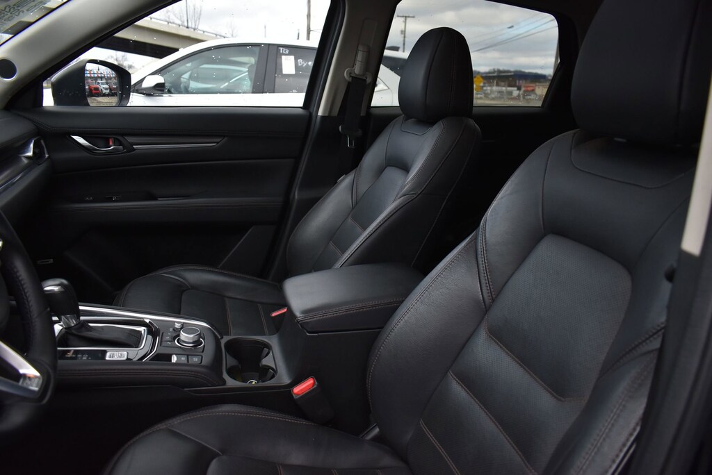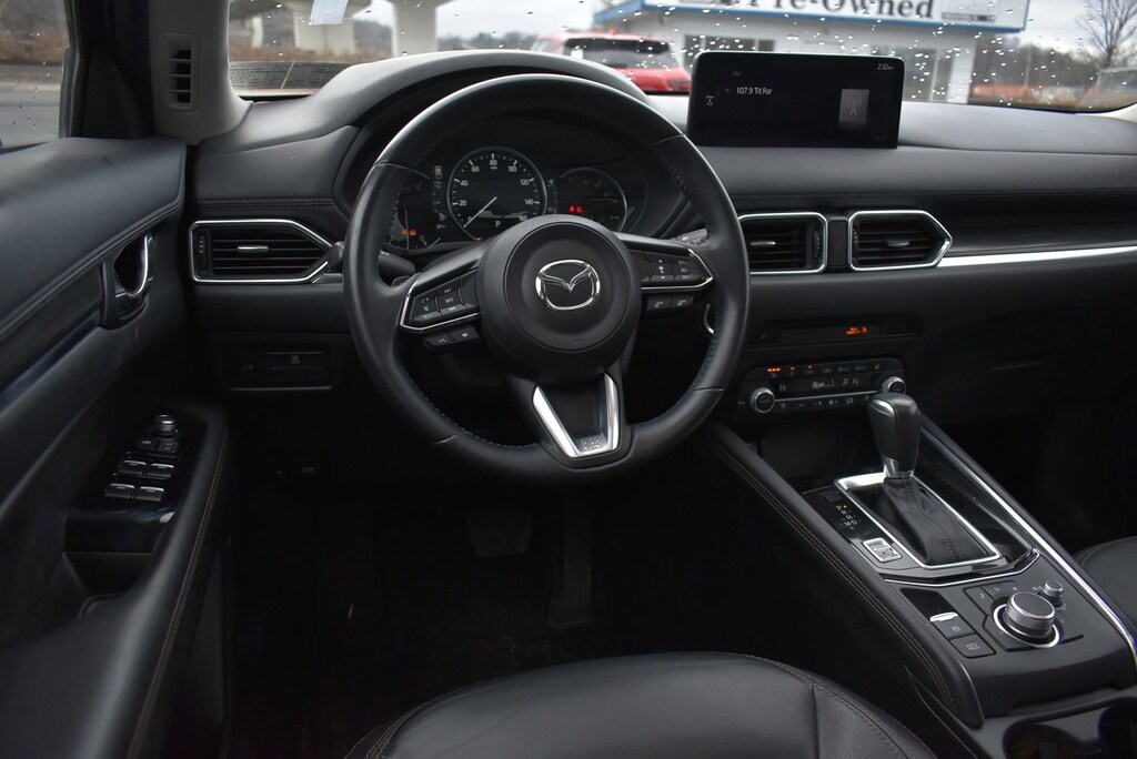 Glockner of Ironton is proud to offer this beautiful-looking 2022 Mazda CX-5 in Jet Black Mica. This 2022 Mazda CX-5 has passed our comprehensive inspection and comes with the following features; Glockner Certified Certified, 10 Speakers, 4-Wheel Disc Brakes, 4.624 Axle Ratio, ABS brakes, Air Conditioning, All-Weather Floor Mats, Alloy wheels, AM/FM radio: SiriusXM, AppLink/Apple CarPlay and Android Auto, Auto High-beam Headlights, Auto-dimming Rear-View mirror, Automatic temperature control, Brake assist, Bumpers: body-color, Cargo Net, Cargo Tray, Delay-off headlights, Driver door bin, Driver vanity mirror, Dual front impact airbags, Dual front side impact airbags, E911 Automatic Emergency Notification, Electronic Stability Control, Emergency communication system: MAZDA CONNECT, Exterior Parking Camera Rear, Four wheel independent suspension, Front anti-roll bar, Front Bucket Seats, Front Center Armrest w/Storage, Front dual zone A/C, Front reading lights, Fully automatic headlights, Garage door transmitter: HomeLink, Heads-Up Display, Heated door mirrors, Heated front seats, Heated rear seats, Heated steering wheel, Heated/Ventilated Front Bucket Seats, Illuminated entry, Infotainment System Voice Command, Leather Seat Trim, Leather Shift Knob, Low tire pressure warning, Memory seat, Multifunction Commander Control, Occupant sensing airbag, Outside temperature display, Overhead airbag, Overhead console, Pandora, Panic alarm, Passenger door bin, Passenger vanity mirror, Power door mirrors, Power driver seat, Power Liftgate, Power moonroof, Power passenger seat, Power steering, Power windows, Premium audio system: Bose, Radio Broadcast Data System Program Information, Radio data system, Radio: AM/FM/HD Audio System, Rain sensing wipers, Rear anti-roll bar, Rear reading lights, Rear seat center armrest, Rear window defroster, Rear window wiper, Remote keyless entry, Retractable Cargo Cover, SMS Text Msg Audio Delivery & Reply, Speed control, Speed-sensing steering, Split folding rear seat, Spoiler, Steering wheel mounted audio controls, Tachometer, Telescoping steering wheel, Tilt steering wheel, Traction control, Trip computer, Turn signal indicator mirrors, Variably intermittent wipers, Ventilated front seats, Wheel Locks, and Wheels: 19 x 7J Aluminum Alloy.