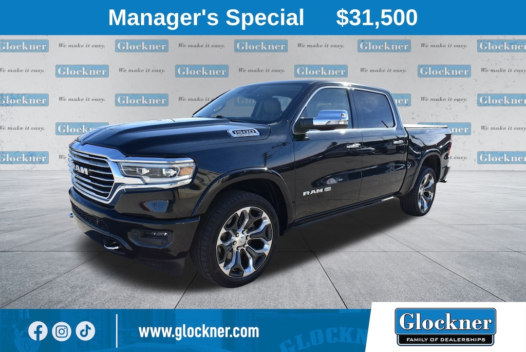 Glockner Chrysler Dodge Jeep Ram of Ashland is proud to offer this stunning-looking 2019 Ram 1500 in Diamond Black Crystal Pearlcoat. This 2019 Ram 1500 has passed our comprehensive inspection and comes with the following features; Advanced Safety Group (Advanced Brake Assist and Parallel & Perp Park Assist w/Stop), Longhorn Level 1 Equipment Group (1-Yr SiriusXM Guardian Trial, Apple CarPlay, Blind Spot & Cross Path Detection, Disassociated Touchscreen Display, Foam Bottle Insert (Door Trim Panel), Google Android Auto, GPS Antenna Input, GPS Navigation, harman/kardon 19 Speaker Premium Sound, HD Radio, Integrated Center Stack Radio, Radio: Uconnect 12 w/Navigation, SiriusXM Satellite Radio, SiriusXM Traffic Plus, SiriusXM Travel Link, SiriusXM w/360L, and USB Host Flip), Quick Order Package 25K Longhorn, #1 Seat Foam Cushion, 10 Speakers, 3 Rear Seat Head Restraints, 3.21 Rear Axle Ratio, 3.92 Rear Axle Ratio, 4 Way Front Headrests, 4-Wheel Disc Brakes, 48V Belt Starter Generator, ABS brakes, Adjustable pedals, Air Conditioning, Alloy wheels, AM/FM radio: SiriusXM, Anti-Spin Differential Rear Axle, Apple CarPlay/Android Auto, Audio memory, Auto High-beam Headlights, Auto-dimming door mirrors, Auto-dimming Rear-View mirror, Automatic temperature control, Brake assist, Bucket Seats, Bumpers: chrome, Compass, Delay-off headlights, Driver door bin, Driver Seat Memory, Driver vanity mirror, Dual front impact airbags, Dual front side impact airbags, Dual-Pane Panoramic Sunroof, Electronic Stability Control, Emergency communication system: SiriusXM Guardian, Front anti-roll bar, Front Bucket Seats, Front Center Armrest w/Storage, Front dual zone A/C, Front fog lights, Front reading lights, Front Seat Back Map Pockets, Front wheel independent suspension, Fully automatic headlights, Garage door transmitter, Genuine wood console insert, Genuine wood dashboard insert, Genuine wood door panel insert, Heated door mirrors, Heated Front Seats, Heated front seats, Heated rear seats, Heated Second Row Seats, Heated Steering Wheel, Heated steering wheel, Illuminated entry, Leather steering wheel, Low tire pressure warning, Manufacturer's Statement of Origin, Memory seat, Navigation System, Occupant sensing airbag, Outside temperature display, Overhead airbag, Overhead console, Panic alarm, ParkView Rear Back-Up Camera, Passenger door bin, Passenger vanity mirror, Pedal memory, Power 4-Way Driver Lumbar Adjust, Power 4-Way Passenger Lumbar Adjust, Power 8-Way Driver & Passenger Seats, Power door mirrors, Power driver seat, Power passenger seat, Power steering, Power windows, Premium Leather Seats w/Filigree, Radio data system, Radio: Uconnect 4C Nav w/8.4" Display, Rain sensing wipers, Rear 60/40 Folding Split Recline Seat, Rear anti-roll bar, Rear seat center armrest, Rear step bumper, Rear window defroster, Remote CD player, Remote keyless entry, Security system, Speed control, Split folding rear seat, Steering wheel mounted audio controls, Tachometer, Telescoping steering wheel, Tilt steering wheel, Traction control, Trip computer, Turn signal indicator mirrors, Variably intermittent wipers, Ventilated Front Seats, Ventilated front seats, Voltmeter, Wheels: 20" x 9" Aluminum Painted/Polished, and Wheels: 22" x 9" Polish/Painted w/Inserts.